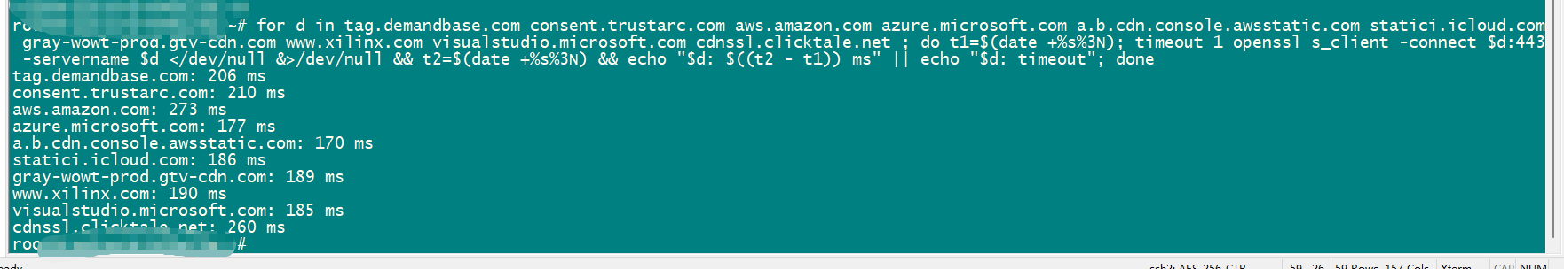 for d in tag.demandbase.com consent.trustarc.com aws.amazon.com azure.microsoft.com a.b.cdn.console.awsstatic.com statici.icloud.com gray-wowt-prod.gtv-cdn.com www.xilinx.com visualstudio.microsoft.com cdnssl.clicktale.net ; do t1=$(date +%s%3N); timeout 1 openssl s_client -connect $d:443 -servername $d </dev/null &>/dev/null && t2=$(date +%s%3N) && echo "$d: $((t2 - t1)) ms" || echo "$d: timeout"; done执行结果如下: