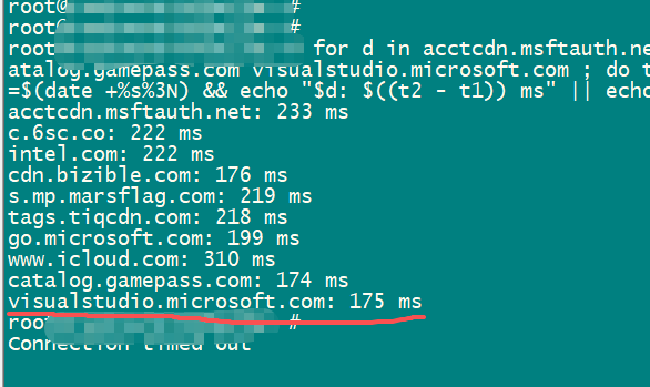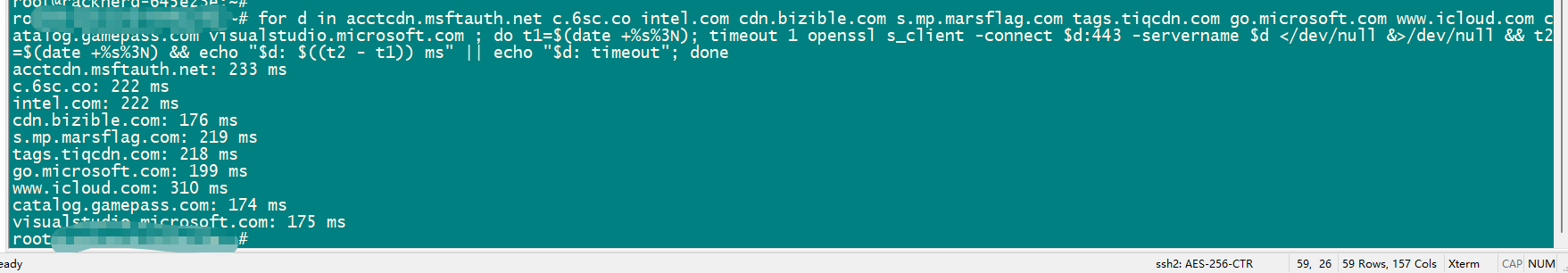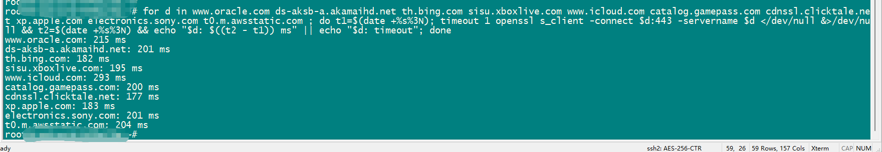 for d in www.oracle.com ds-aksb-a.akamaihd.net th.bing.com sisu.xboxlive.com www.icloud.com catalog.gamepass.com cdnssl.clicktale.net xp.apple.com electronics.sony.com t0.m.awsstatic.com ; do t1=$(date +%s%3N); timeout 1 openssl s_client -connect $d:443 -servername $d </dev/null &>/dev/null && t2=$(date +%s%3N) && echo "$d: $((t2 - t1)) ms" || echo "$d: timeout"; done执行结果如下: