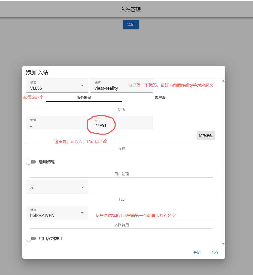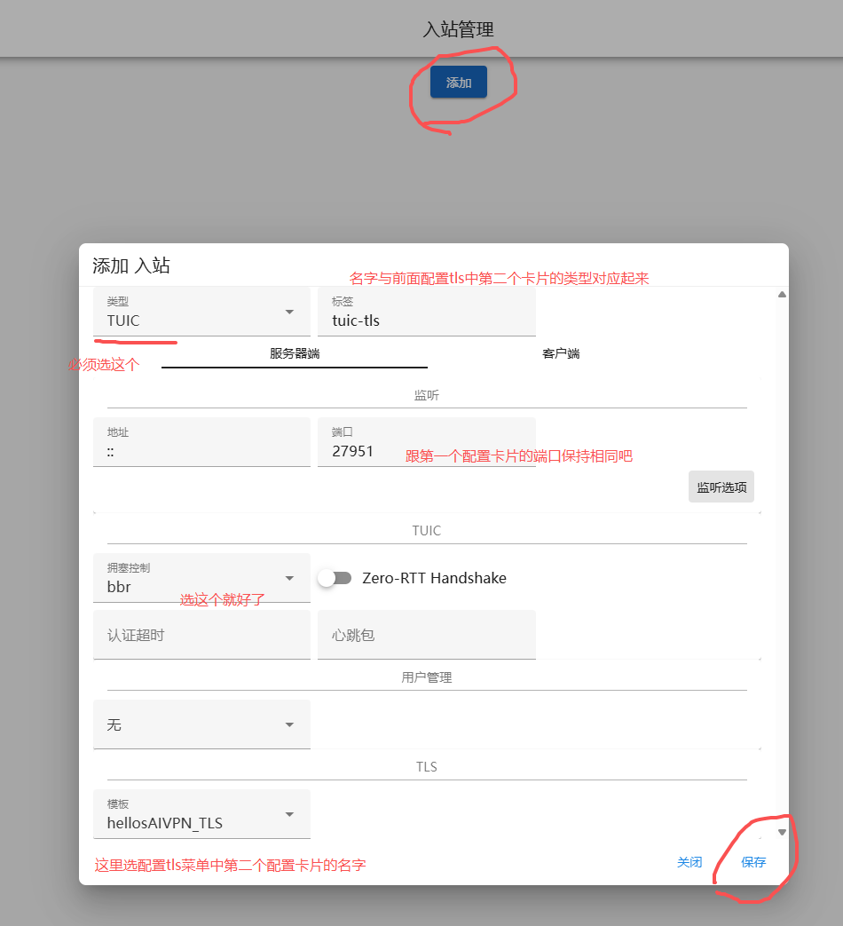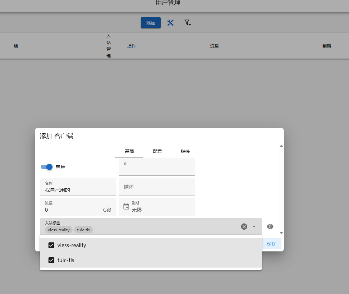 这里点击"添加"按钮,如下: 名字随便填写,底下入站标签需要勾选这2个
